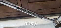 New decals except for the seat tube base one. The 1983 Kuwahara Laserlite is a classic example of an Old School BMX bike. Known for its sleek design and performance capabilities, this BMX model holds a special place in the hearts of collectors and enthusiasts alike. With its distinctive features and historical significance, the 1983 Kuwahara Laserlite remains a sought-after piece in the world of transportation collectables, particularly for those interested in vintage bicycles and BMX culture.