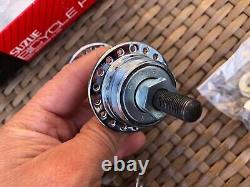 NOS Nouveaux anciens stocks de moyeux Suzue Old School BMX en chrome. Neufs et inutilisés, dans leur boîte d'origine. Ils tournent, mais sont un peu raides, il faudra probablement les travailler un peu pour les libérer complètement. Ils ont été laissés dans la boîte pendant plusieurs années.